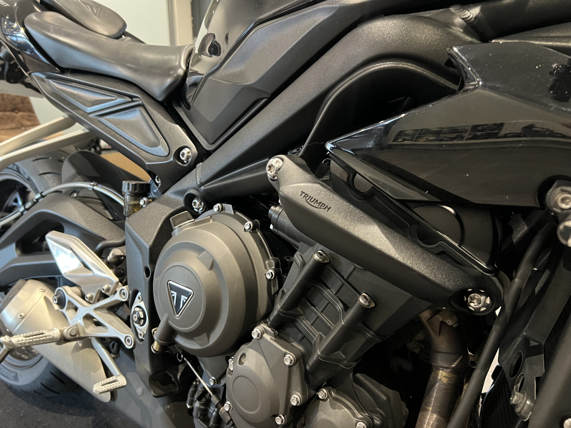 Contrairement aux Street Triple classiques de la même époque qui utilisaient un moteur 765 cm³, cette version dispose d’un moteur trois cylindres en ligne de 660 cm³ plus adapté au bridage A2 (puissance maximale bridable à 47,5 ch / 35 kW) tout en restant vivante quand elle est utilisée sans bridage légal.